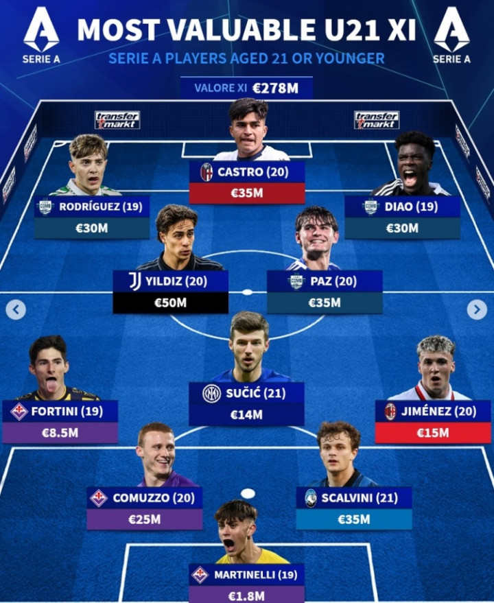 德转列意甲U21最贵阵: 伊尔迪兹领衔, 科莫、佛罗伦萨各3人